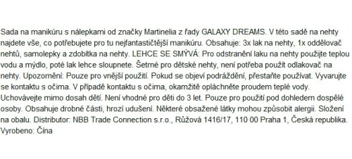 MARTINELIA Galaxy dreams Sada na manikúru. Obsahuje: 3x lak na nehty, 1x oddělovač nehtů, samolepky a zdobítka na nehty. Pro odstranění laku na nehty použijte teplou vodu a mýdlo, poté lak lehce sloupnete. Šetrné pro dětské nehty, není potřeba použít odlakovač na nehty.