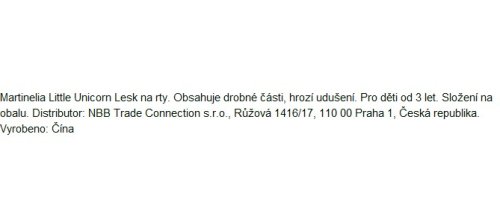 Lesk na rty LITTLE UNICORN. Obsahuje drobné části, hrozí udušení. V případě podráždění, přestaňte používat. Složení na obalu. Pro děti od 3 let. Distributor: NBB Trade Connection s.r.o., Růžová 1416/17, 110 00 Praha 1, ČR Vyrobeno: Čína