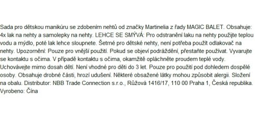 MARTINELIA Magic ballet Sada na manikúru. Obsahuje: 4x lak na nehty a samolepky na nehty. Pro odstranění laku na nehty použijte teplou vodu a mýdlo, poté lak lehce sloupnete. Šetrné pro dětské nehty, není potřeba použít odlakovač na nehty.