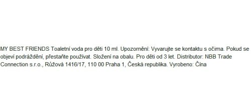 MY BEST FRIENDS Toaletní voda pro děti 10 ml. Upozornění: Vyvarujte se kontaktu s očima. Pokud se objeví podráždění, přestaňte používat. Složení na obalu. Pro děti od 3 let. Vyrobeno: Čína