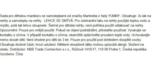 MARTINELIA Yummy Mini sada na manikúru. Obsahuje: 3x lak na nehty a samolepky na nehty. Pro odstranění laku na nehty použijte teplou vodu a mýdlo, poté lak lehce sloupnete. Šetrné pro dětské nehty, není potřeba použít odlakovač na nehty.
