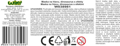 Maska na hlavu dinosaurus s efekty. Velikost 28x22x18cm. Maska se nasazuje na hlavu. Pohybem hlavy se otevírá čelist, a aktivuje se dinosauří řev. Zvukové efekty. 3 polohy otevření čelistí s různými zvuky (vrčení, slabší řev, hlasitý řev). Tlačítko on/off. 2xAAA baterie součástí.
