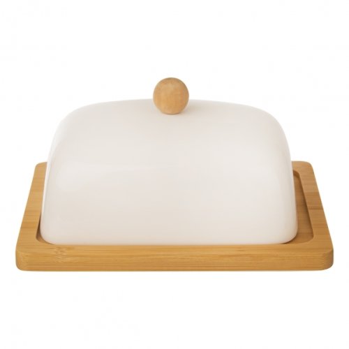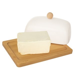 Nepraktické umaštěné obaly od másla, které se navíc při krájení často proříznou, nahradí jednoduše praktická bílá porcelánová máslenka s úchytem a spodní částí z bambusu .