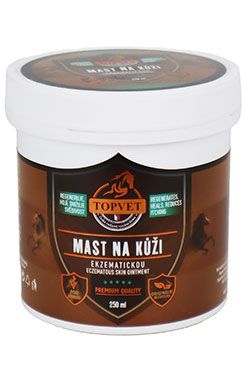 Mast na ekzematickou kůži je určena pro koně s kožními problémy. Originální receptura pokožku vyživuje, hydratuje a chrání před vnějším prostředím. Bylinná kompozice pokožku zvláčňuje, snižuje svědivost a obnovuje elasticitu. Je vhodná na rozškrábanou pokožku pro koně s letní vyrážkou. Mast vykazuje dlouhodobý účinek.