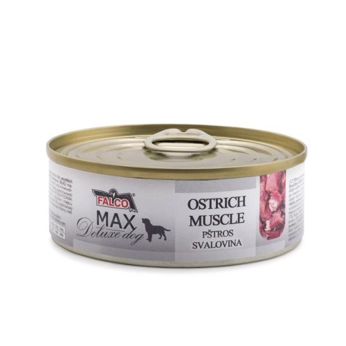 Konzerva řady MAX Deluxe s pštrosí svalovinou má vynikající nutriční a dietní hodnoty, vysoký obsah hořčíku, který ovlivňuje správnou funkci svalů a nervů, dále pak obsahuje sodík a vápník, jenž příznivě působí na zpevňování kostí v kloubech. Vše je v přírodní formě.
