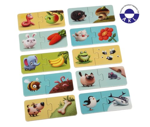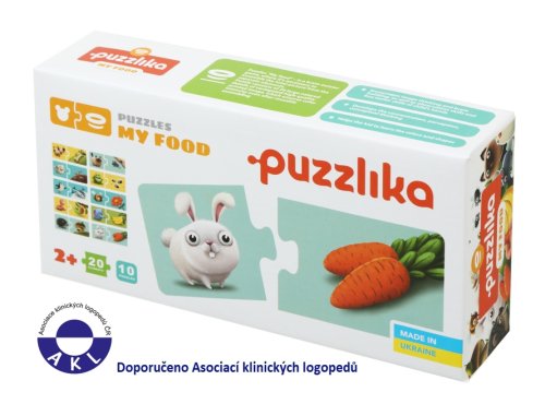 Puzzlika, nová značka puzzlů s moderním kreativním designem, přináší pro malé děti aktivní učení formou zábavné hry. Víte které zvířátko co jí? V krabičce naleznete 20 velkých pevných puzzlů tvořících 10 samostatných dvojic kartiček, které spolu tematicky souvisejí. Jedna polovina kartiček obsahuje ilustrace jednotlivých zvířátek a na druhé polovině kartiček je vyobrazeno jídlo, kterým se živí. Cílem je vytvořit správné kombinace a nasbírat co nejvíce párů. Naučné puzzle je skvělá hra pro malé děti, která u nich rozvíjí logické myšlení, představivost, kreativitu, jemnou motoriku a různé poznávací znalosti. Puzzle jsou vyrobeny z velice pevného vícevrstvého kartonu s lesklým povrchem. Karton byl vyroben z kvalitního, ekologicky pěstovaného dřeva. Puzzle je možné otřít vlhkým hadříkem. Nevhodné pro děti do 2 let. Vyrobeno v Evropě.Věk 2+