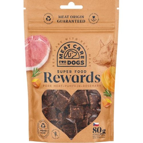 Přírodní pamlsky z čerstvého masa neobsahují obiloviny, přidané cukry ani umělá barviva. Vepřové maso je v pamlscích jediným zdrojem proteinu (= monoprotein) a je ideální volbou pro psy alergické na kuřecí či hovězí maso. Dýně zlepšuje kvalitu srsti (lesk a pevnost), posiluje imunitní systém, má detoxikační účinky a je hypoalergenní. Rozmarýn je prospěšný pro zdraví srdce a má antioxidační účinky. Chuť a vůně rozmarýnu jsou navíc pro psy velmi atraktivní. Jablečná vláknina blahodárně ovlivňuje střevní mikroflóru a pomáhá udržovat optimální hladinu krevního cukru. Baleno v plně recyklovatelném obalu v ochranné atmosféře pro zaručenou kvalitu. Výroba probíhá pod denním veterinárním dohledem a podle pravidla welfare. Lehké zauzení na bukové štěpce a vysoký podíl čerstvého masa dodává pamlskům jedinečnou chuť a vůni. Hlavní přednosti: