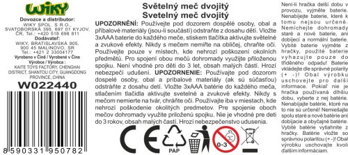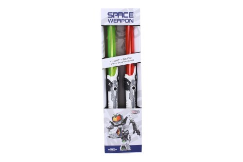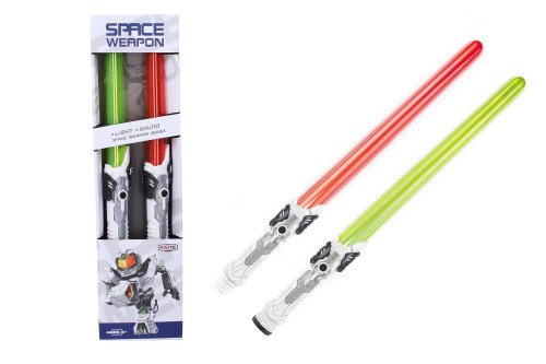 Meč světelný dvojitý. Velikost 138 cm. Součástí 2 meče a spojka s držadlem pro pohodlné otáčení dvojitého meče kolem své osy. Světelné a zvukové efekty. 3xAAA baterie (pro každý meč) nejsou součástí. Aktivace efektů tlačítkem na rukojeti.