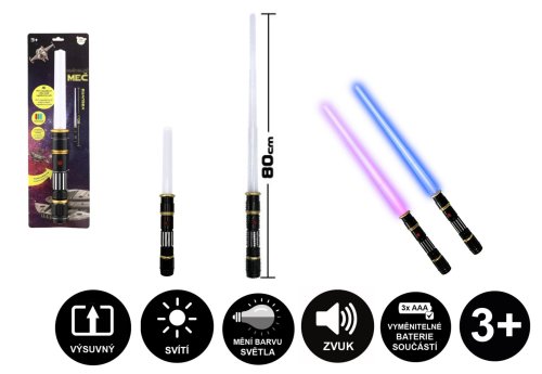 Skládací meč při pohybu mění zvuk, při zasažení cíle vydává zvuk. Svítí a mění barvy. Na baterie 3x AAA, které jsou součástí hračky. Rozměr meče: 80 cm Vhodné pro děti od 3 let