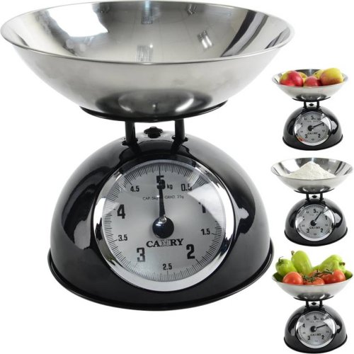 Retro váha s nerezovou miskou a váživostí 5 kg.