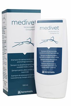 Speciální a účinný šampon Medivet k řešení závažných projevů šupinatění a svědění kůže zvířat. Přípravek obsahuje účinné látky ketokonazol a octopirox, které působí na přemnoženou kožní mikroflóru. Díky jejich kombinaci je výrobek účinný v podpůrné péči při plísňových, kvasinkových a sekundárních bakteriálních infekcí kůže s projevy šupinatění a svědění.