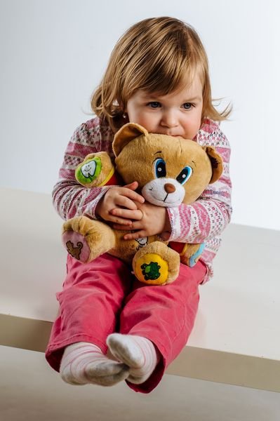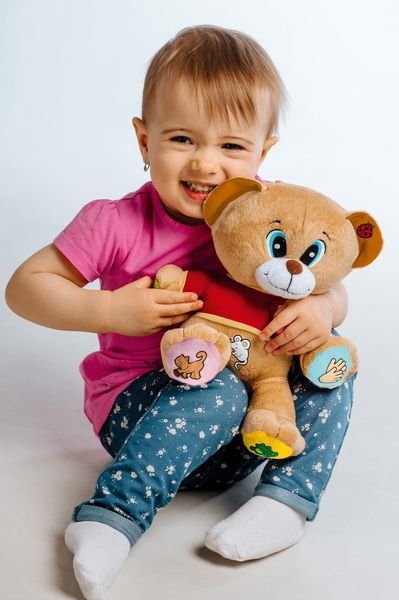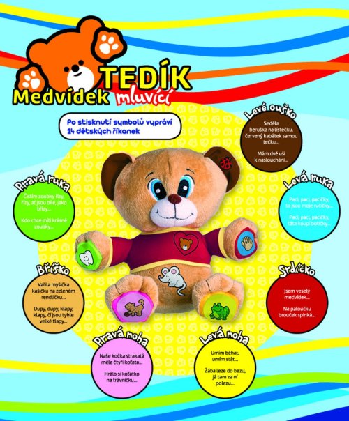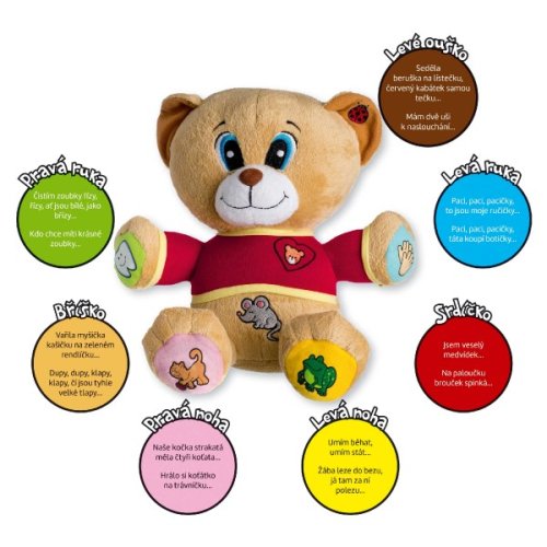 Veselý medvídek Tedík naučí děti 14 známých českých říkanek např. Paci, paci, pacičky...Mám dvě uši k naslouchání...Čistím zoubky řízy, řízy...atd. Stačí zmáčknout symbol a poslouchat. Vhodný pro děti od 12 měsíců, velikost 30 cm.