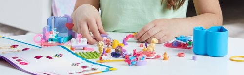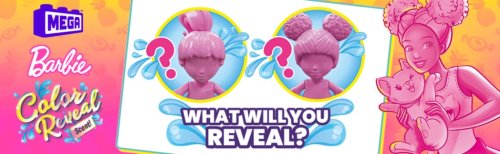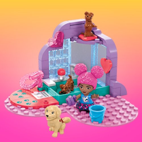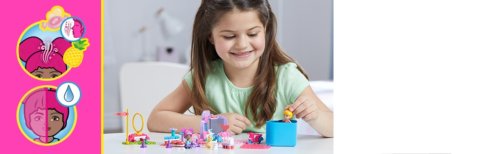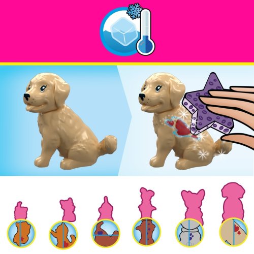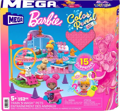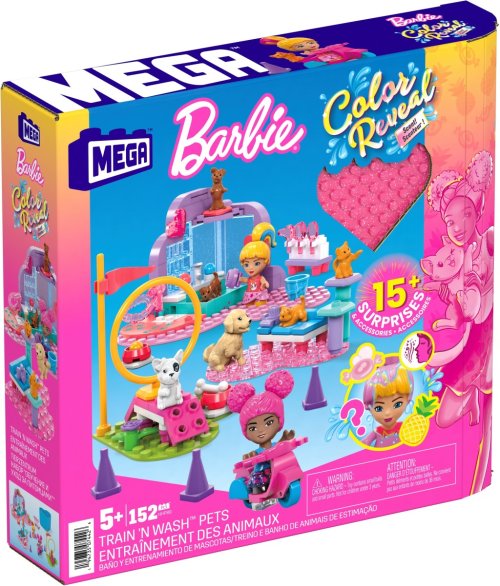 Stavebnice MEGA™ Construx Barbie® Color Reveal™ Trénuj a pečuj o mazlíčky přinášejí při rozbalování zážitek plný překvapení. Vzhled každé mikropanenky je kouzelným tajemstvím, které čeká na odhalení. Začněte otevřením obalu ve tvaru srdce a najděte 2 sáčky s překvapením. Naplňte nádobu teplou vodou, vložte do ní mikropanenku a otáčejte s ní, abyste odhalili její vzhled a vůni. Poté ponořte houbičku ve tvaru hvězdy do ledové vody, abyste změnili její vzhled – teplou vodou ji změňte zpět a vše zopakujte. Umístěním zbývajících tajemných doplňků do teplé vody odhalíte další překvapení. Postavte stanici pro výcvik domácích mazlíčků a naučte je novým trikům. Můžete postavit i skútr, na kterém se zvířátka mohou projet.
