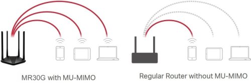 Tradiční router musí při současném připojení více zařízení řadit jednotlivá zařízení do fronty, což způsobuje přetížení sítě. Díky technologii MU-MIMO však směrovač MR30G komunikuje s více zařízeními současně, takže připojená zařízení dosahují vyšších rychlostí než standardní AC směrovače, což zvyšuje efektivitu sítě.