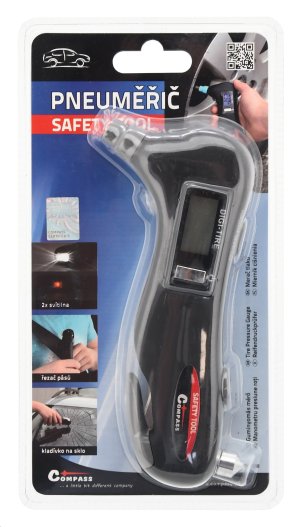 Digitální pneuměřič Compass SAFETY TOOL umí mnohem více než jen změřit tlak v pneumatikách automobilu. Poslouží také jako šikovný univerzální pomocník při dopravní nehodě. Digitální displej s modrým podsvícením nabízí volbu jednotek měření z PSI, Bar, kPa, kg/cm2.