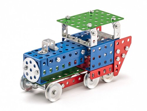 Z této jednovrstvé stavebnice se dá sestavit 10 různých modelů Např. lokomotivu, nákladní vagón a několik dalších železničních modelů