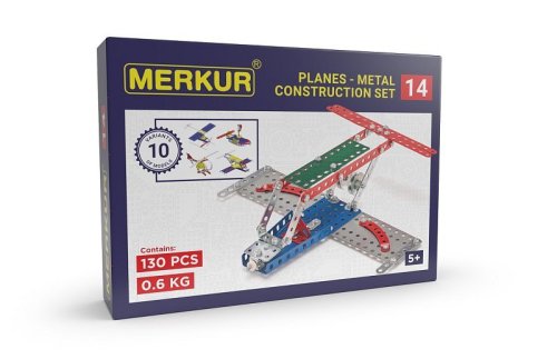 Klasická jednovrstvá stavebnice Merkur 14 – letadlo. Stavebnice obsahuje součástky potřebné pro stavbu modelů letadel. Součástí stavebnice je návodová knížka s návodem na stavbu 10 různých modelů. Tato jedinečná sada je ideálním nástrojem pro rozvoj technických dovedností a představivosti dětí. Stavebnice obsahuje kvalitní kovové díly, které se snadno spojují šroubky, což podporuje rozvoj jemné motoriky, logického myšlení a soustředění. Počet dílků: 130. Úroveň Merkur obtížnosti: 2. Barvy, velikost a vzhled výrobku se mohou lišit oproti uvedeným fotografiím. Baleno v krabičce. Rozměry balení: 18 x 26 x 5 cm. Nevhodné pro děti mladší 3 let. Věk: 5+