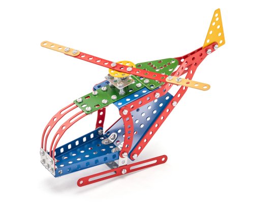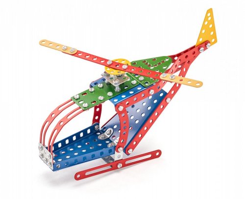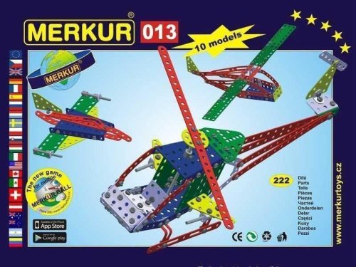 Klasická jednovrstvá stavebnice Merkur 13 – vrtulník. Stavebnice obsahuje součástky potřebné pro stavbu modelů letecké techniky. Součástí stavebnice je návodová knížka s návodem na stavbu 10 různých modelů. Tato jedinečná sada je ideálním nástrojem pro rozvoj technických dovedností a představivosti dětí. Stavebnice obsahuje kvalitní kovové díly, které se snadno spojují šroubky, což podporuje rozvoj jemné motoriky, logického myšlení a soustředění. Počet dílků: 222. Úroveň Merkur obtížnosti: 2. Barvy, velikost a vzhled výrobku se mohou lišit oproti uvedeným fotografiím. Baleno v krabičce. Rozměry balení: 18 x 26 x 5 cm. Nevhodné pro děti mladší 3 let. Věk: 5+