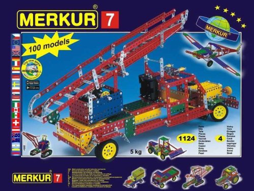 Velká čtyřvrstvá klasická stavebnice Merkur 7 – velký set. Stavebnice obsahuje mimo základní sestavu dílů také součástky nutné pro stavbu velkého požárního auta, velkých jeřábů a dalších modelů. Součástí stavebnice je velká návodová knížka s návodem na stavbu 100 modelů. Tato jedinečná sada je ideálním nástrojem pro rozvoj technických dovedností a představivosti dětí. Stavebnice obsahuje kvalitní kovové díly, které se snadno spojují šroubky, což podporuje rozvoj jemné motoriky, logického myšlení a soustředění. Počet dílků: 1124. Úroveň Merkur obtížnosti: 4. Rozměry balení: 36 x 54 x 6 cm. Nevhodné pro děti mladší 3 let. Věk: 7+