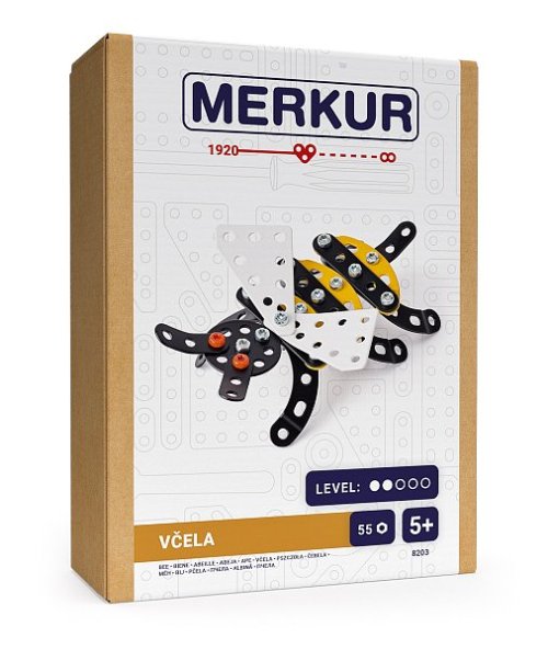 Kovový model Včely z kolekce hmyzáků obsahuje součástky nutné pro sestavení včely. V balení najdete podrobný návod, Merkur sadu nářadí a unikátní Merkur díly. Merkur díly jsou univerzální a tak vás neomezí v jakékoli modifikaci a nápadu. Stavebnici tak můžete sestavit podle přiloženého návodu nebo čistě podle svých představ. Se sestavenými modely si lze hrát, jsou velmi odolné. Podporuje a rozvíjí manuálních schopnosti, logické myšlení, soustředění. Rozměr balení: 18x13,5x5cm cm.Rozměr výrobku: 12,5x6,5x4,5cm cm.Počet dílků: 55. Nevhodné pro děti do tří let. Doporučený věk: 5+