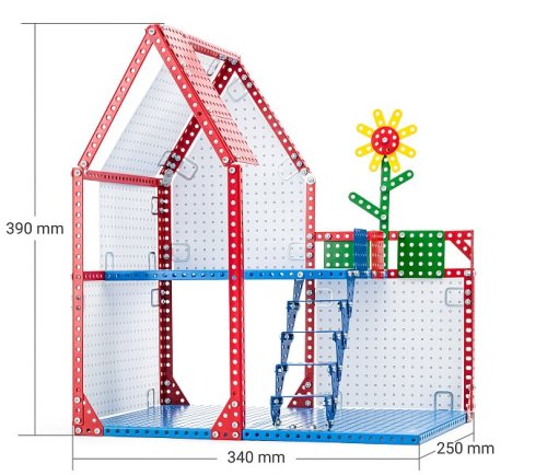 Ponořte se do světa kreativity a zábavy se stavebnicí kovového domečku pro panenky od společnosti Merkur. Tato jedinečná sada je ideálním nástrojem pro rozvoj technických dovedností a představivosti dětí. Díky kovovým dílkům si malí stavitelé mohou postavit vlastní domeček pro panenky a přizpůsobit si ho podle svých představ. Stavebnice obsahuje kvalitní kovové díly, které se snadno spojují šroubky, což podporuje rozvoj jemné motoriky, logického myšlení a soustředění. Děti se naučí sestavovat jednotlivé díly tak, aby vytvořily realistický model domečku, který pak mohou využít při hře se svými panenkami. Hotový domeček má dvě patra, včetně schodiště vedoucího do druhého poschodí. Součástí je 8 dílků, které představují stěny pokojů a děti si je mohou pomalovat podle vlastní fantazie. Domeček je kompatibilní se sadou 48018, která obsahuje nábytek do domečku pro panenky. Sada obsahuje: 345 dílů. Úroveň Merkur obtížnosti: 3. Ekologicky baleno. Baleno v krabičce. Rozměry složeného domečku: 39 x 34 x 25 cm. Rozměry balení: 23 x 33,3 x 5,7 cm. Věk: 5+