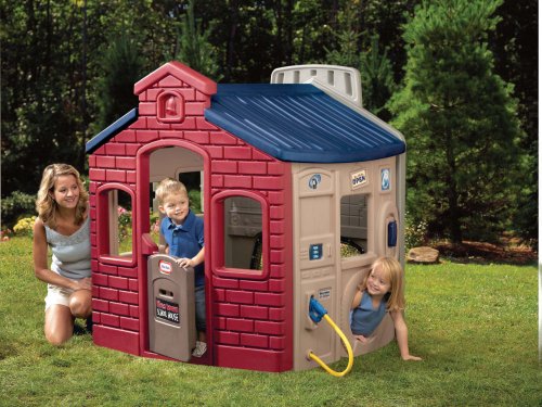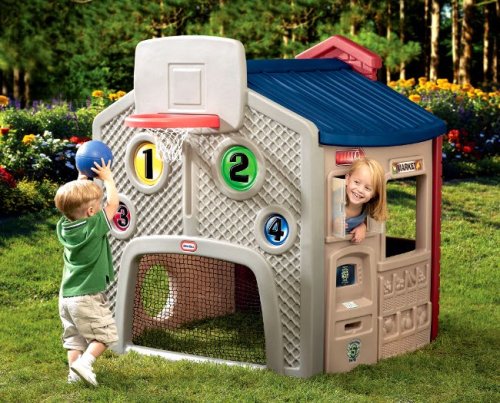 Na sportovní stěně najdete basketballový koš, fotbalovou branku a čtyři očíslované cíle. Součástí balení je i míč. Na stěně obchod na děti čeká pult, bankomat, servírovací okénko a vylisované detaily ovoce v přepravkách. Na stěně pro motoristy si děti mohou vyhrát s čerpací stanicí s tankovacím stojanem, přenosným telefonem. Přední stěna je koncipována jako vchod do školy, uvnitř děti najdou stoleček a tabuli. Rozměr: 147dx155šx140v cm.