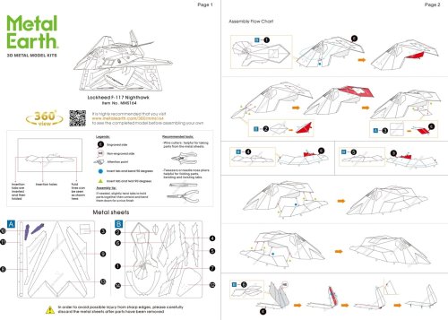 Jednotlivé díly vyjměte z kovových plátků, v případě potřeby použijte malé štípací nůžky (nejsou součástí). Dílky se spojují k sobě pomocí zámků tvořených úchytem (zobáčkem) a otvorem. Zobáček ohněte pomocí malých tenkých kleští (nejsou součástí) a postupně spojte všechny zámky až vznikne velmi realistický mistrovský kousek!