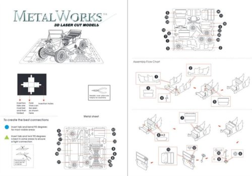 Jednotlivé díly vyjměte z kovových plátků, v případě potřeby použijte malé štípací nůžky (nejsou součástí). Dílky se spojují k sobě pomocí zámků tvořených úchytem (zobáčkem) a otvorem. Zobáček ohněte pomocí malých tenkých kleští (nejsou součástí) a postupně spojte všechny zámky až vznikne velmi realistický mistrovský kousek!