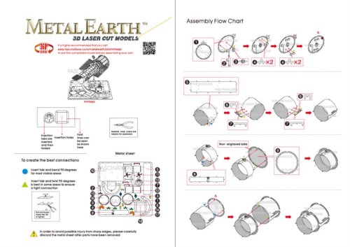 Jednotlivé díly vyjměte z kovových plátků, v případě potřeby použijte malé štípací nůžky (nejsou součástí). Dílky se spojují k sobě pomocí zámků tvořených úchytem (zobáčkem) a otvorem. Zobáček ohněte pomocí malých tenkých kleští (nejsou součástí) a postupně spojte všechny zámky až vznikne velmi realistický mistrovský kousek!