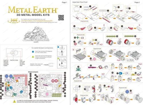 Jednotlivé díly vyjměte z kovových plátků, v případě potřeby použijte malé štípací nůžky (nejsou součástí). Dílky se spojují k sobě pomocí zámků tvořených úchytem (zobáčkem) a otvorem. Zobáček ohněte pomocí malých tenkých kleští (nejsou součástí) a postupně spojte všechny zámky až vznikne velmi realistický mistrovský kousek!