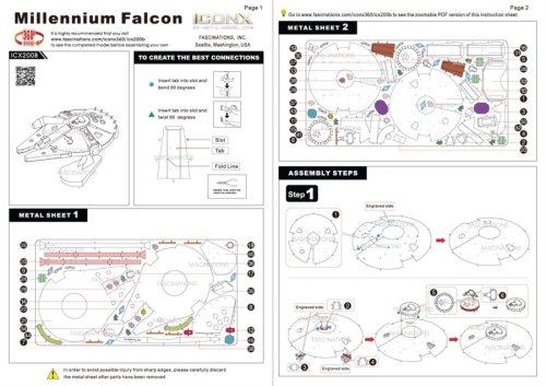 Jednotlivé díly vyjměte z kovových plátků, v případě potřeby použijte malé štípací nůžky (nejsou součástí). Dílky se spojují k sobě pomocí zámků tvořených úchytem (zobáčkem) a otvorem. Zobáček ohněte pomocí malých tenkých kleští (nejsou součástí) a postupně spojte všechny zámky až vznikne velmi realistický mistrovský kousek!