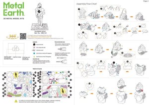 Jednotlivé díly vyjměte z kovových plátků, v případě potřeby použijte malé štípací nůžky (nejsou součástí). Dílky se spojují k sobě pomocí zámků tvořených úchytem (zobáčkem) a otvorem. Zobáček ohněte pomocí malých tenkých kleští (nejsou součástí) a postupně spojte všechny zámky až vznikne velmi realistický mistrovský kousek!