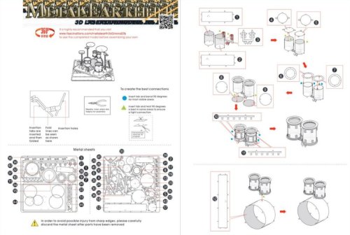 Jednotlivé díly vyjměte z kovových plátků, v případě potřeby použijte malé štípací nůžky (nejsou součástí). Dílky se spojují k sobě pomocí zámků tvořených úchytem (zobáčkem) a otvorem. Zobáček ohněte pomocí malých tenkých kleští (nejsou součástí) a postupně spojte všechny zámky až vznikne velmi realistický mistrovský kousek!