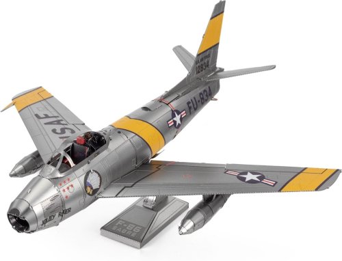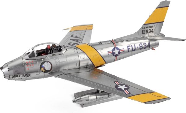 F-86 Sabre byl americký transsonický stíhací letoun, který byl poprvé nasazen během korejské války. Jako první americký stíhač s šípovitými křídly byl F-86 Sabre navržen tak, aby čelil sovětskému MIGu-15. Vyráběný společností North American Aviation, byl F-86 považován za jeden z nejvýznamnějších bojových letounů počátku 50. let.. Sada pro vytvoření fascinujícího kovového 3D modelu . Stavba puzzle METAL EARTH vyžaduje trpělivost a šikovné ruce. Výsledek práce však plně vyváží vynaložené úsilí. Miniaturní repliky jsou působivou a poutavou dekorací. Z čtvercových plátků oceli Vám pod rukama vyrostou detailně propracované, fascinující modely. Autentický vzhled 3D puzzle METAL EARTH je dosažen díky detailnímu laserovému gravírování . Nářadí není součástí balení. PRACOVNÍ POSTUP: Jednotlivé díly vyjměte z kovových plátků, v případě potřeby použijte malé štípací nůžky (nejsou součástí). Dílky se spojují k sobě pomocí zámků tvořených úchytem (zobáčkem) a otvorem. Zobáček ohněte pomocí malých tenkých kleští (nejsou součástí) a postupně spojte všechny zámky až vznikne velmi realistický mistrovský kousek! Rozměr složeného puzzle cca 15,6 x 15 x 8 cm