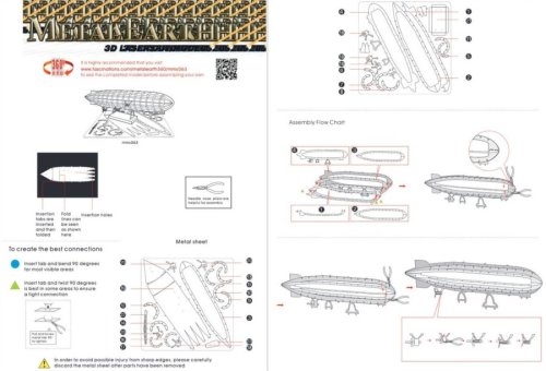 Jednotlivé díly vyjměte z kovových plátků, v případě potřeby použijte malé štípací nůžky (nejsou součástí). Dílky se spojují k sobě pomocí zámků tvořených úchytem (zobáčkem) a otvorem. Zobáček ohněte pomocí malých tenkých kleští (nejsou součástí) a postupně spojte všechny zámky až vznikne velmi realistický mistrovský kousek!