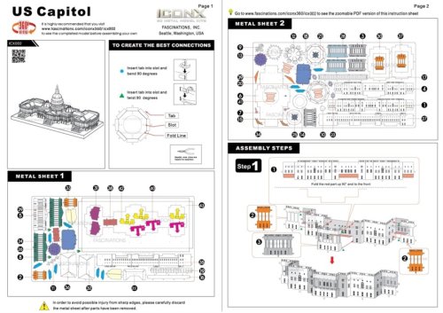 Jednotlivé díly vyjměte z kovových plátků, v případě potřeby použijte malé štípací nůžky (nejsou součástí). Dílky se spojují k sobě pomocí zámků tvořených úchytem (zobáčkem) a otvorem. Zobáček ohněte pomocí malých tenkých kleští (nejsou součástí) a postupně spojte všechny zámky až vznikne velmi realistický mistrovský kousek!