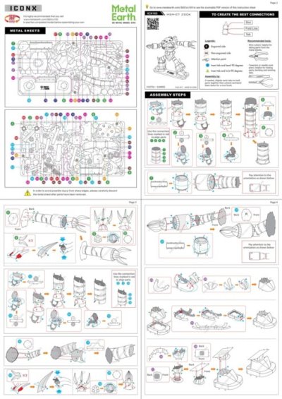 Jednotlivé díly vyjměte z kovových plátků, v případě potřeby použijte malé štípací nůžky (nejsou součástí). Dílky se spojují k sobě pomocí zámků tvořených úchytem (zobáčkem) a otvorem. Zobáček ohněte pomocí malých tenkých kleští (nejsou součástí) a postupně spojte všechny zámky až vznikne velmi realistický mistrovský kousek!