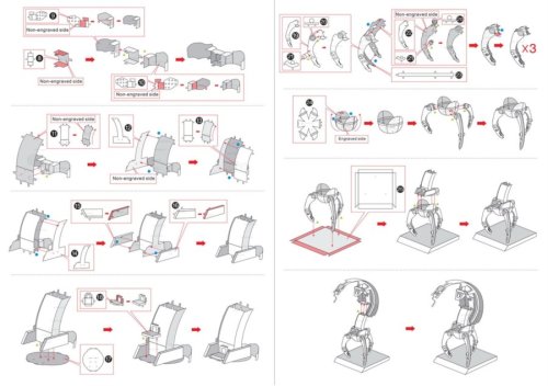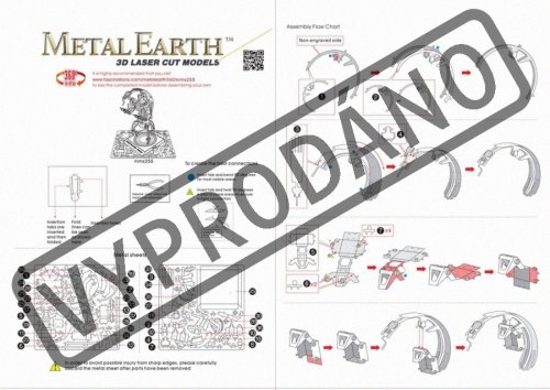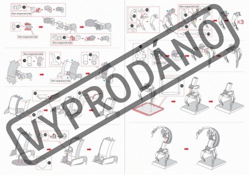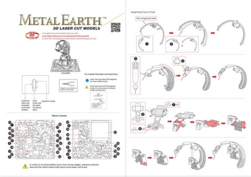 Jednotlivé díly vyjměte z kovových plátků, v případě potřeby použijte malé štípací nůžky (nejsou součástí). Dílky se spojují k sobě pomocí zámků tvořených úchytem (zobáčkem) a otvorem. Zobáček ohněte pomocí malých tenkých kleští (nejsou součástí) a postupně spojte všechny zámky až vznikne velmi realistický mistrovský kousek!