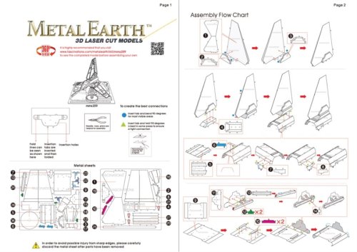 Jednotlivé díly vyjměte z kovových plátků, v případě potřeby použijte malé štípací nůžky (nejsou součástí). Dílky se spojují k sobě pomocí zámků tvořených úchytem (zobáčkem) a otvorem. Zobáček ohněte pomocí malých tenkých kleští (nejsou součástí) a postupně spojte všechny zámky až vznikne velmi realistický mistrovský kousek!