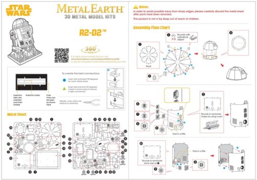 Jednotlivé díly vyjměte z kovových plátků, v případě potřeby použijte malé štípací nůžky (nejsou součástí). Dílky se spojují k sobě pomocí zámků tvořených úchytem (zobáčkem) a otvorem. Zobáček ohněte pomocí malých tenkých kleští (nejsou součástí) a postupně spojte všechny zámky až vznikne velmi realistický mistrovský kousek!