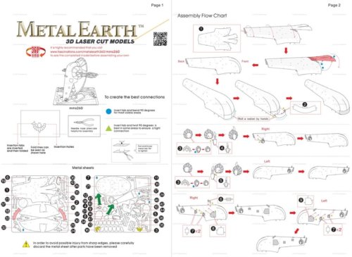 Jednotlivé díly vyjměte z kovových plátků, v případě potřeby použijte malé štípací nůžky (nejsou součástí). Dílky se spojují k sobě pomocí zámků tvořených úchytem (zobáčkem) a otvorem. Zobáček ohněte pomocí malých tenkých kleští (nejsou součástí) a postupně spojte všechny zámky až vznikne velmi realistický mistrovský kousek!
