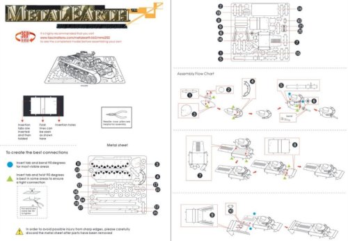 Jednotlivé díly vyjměte z kovových plátků, v případě potřeby použijte malé štípací nůžky (nejsou součástí). Dílky se spojují k sobě pomocí zámků tvořených úchytem (zobáčkem) a otvorem. Zobáček ohněte pomocí malých tenkých kleští (nejsou součástí) a postupně spojte všechny zámky až vznikne velmi realistický mistrovský kousek!