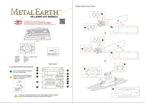 Jednotlivé díly vyjměte z kovových plátků, v případě potřeby použijte malé štípací nůžky (nejsou součástí). Dílky se spojují k sobě pomocí zámků tvořených úchytem (zobáčkem) a otvorem. Zobáček ohněte pomocí malých tenkých kleští (nejsou součástí) a postupně spojte všechny zámky až vznikne velmi realistický mistrovský kousek!