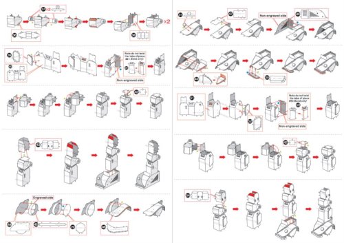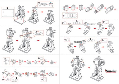 Jednotlivé díly vyjměte z kovových plátků, v případě potřeby použijte malé štípací nůžky (nejsou součástí). Dílky se spojují k sobě pomocí zámků tvořených úchytem (zobáčkem) a otvorem. Zobáček ohněte pomocí malých tenkých kleští (nejsou součástí) a postupně spojte všechny zámky až vznikne velmi realistický mistrovský kousek!