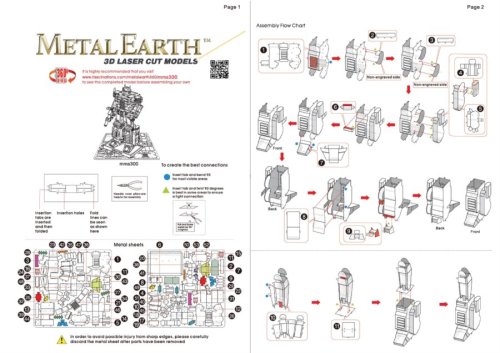Jednotlivé díly vyjměte z kovových plátků, v případě potřeby použijte malé štípací nůžky (nejsou součástí). Dílky se spojují k sobě pomocí zámků tvořených úchytem (zobáčkem) a otvorem. Zobáček ohněte pomocí malých tenkých kleští (nejsou součástí) a postupně spojte všechny zámky až vznikne velmi realistický mistrovský kousek!