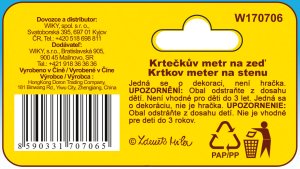 Tak o kolik vám dítko povyrostlo? Zeptáme se Krtečka. Dětský nástěnný metr s Krtečkem a jeho kamarády vám ukáže, o kolik vaše děti vyrostly a zároveň se stane pěknou dekorací do dětského pokojíku. Rozsah stupnice: 70 - 150 cm. Velikost: 890 x 105 x 3 mm. Rozměry balení 12 x 51 x 0,5 cm. Vhodné pro děti od 3 let.