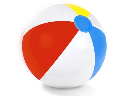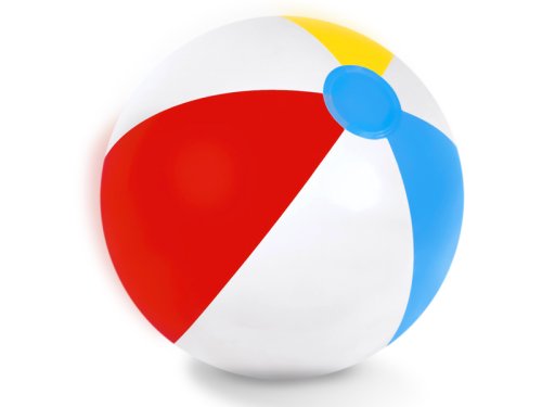 Barevný nafukovací míč se skvěle hodí na hraní ve vodě i na zahradě. Míč má tři barevné pruhy - modrý, červený a žlutý. Průměr míče je 50 cm. Je vhodný již od 24 měsíců.