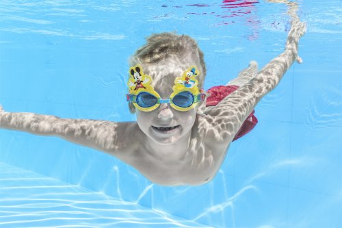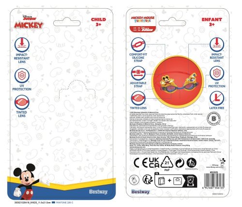 Bestway® Disney® Plavecké brýle s designem Mickey Mouse & Donald Duck jsou ideálním společníkem pro malé milovníky vody, kteří si chtějí zaplavat se svými oblíbenými postavičkami. Plavecké brýle mají tónovaná, nárazuvzdorná polykarbonátová skla s UV ochranou, která chrání citlivé oči dětí před škodlivými slunečními paprsky a zároveň zajišťují jasné vidění pod vodou. Měkké silikonové očnice poskytují pohodlné nošení a zabraňují pronikání vody. Nastavitelný nosní most a silikonové čelenka