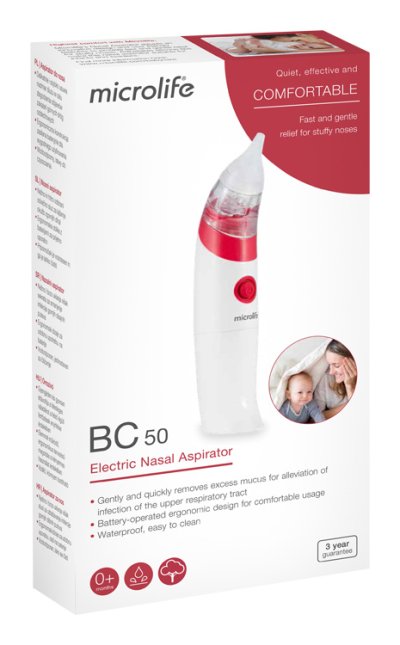 Elektrická nosní odsávačka Microlife BC 50 poskytuje jemné a nepřetržité odsávání pro snadné a efektivní odstranění nosního hlenu u dětí ve věku od 0 měsíců. Jemně a rychle odstraňuje přebytečný hlen ke zmírnění infekce horních cest dýchacích. Microlife BC 50 vyčistí nos dítěte jednoduše, hygienicky a efektivně během několika vteřin.