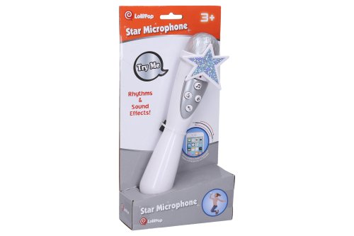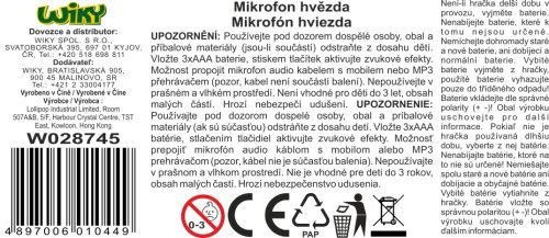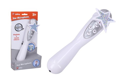 Mikrofon hvězda. Velikost 23 cm. Zvukové efekty. 3xAAA baterie součástí. 3 melodie, aplaus, pískot, automatické vypínání. Možnost připojení MP3 přehrávače nebo mobilu, kabel není součástí.